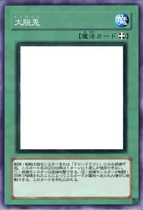 | 獣族・獣戦士族モンスターまたは「ラビードラゴン」にのみ装備可 能。このカード名の②の効果は1ターンに1度しか使用できない。 ①:装備モンスターは直接攻撃できる。②:装備モンスターが戦闘・効果で破壊されたことによってこのカードが墓地へ送られた場合に発動できる。このカードを手札に加える。 | |||