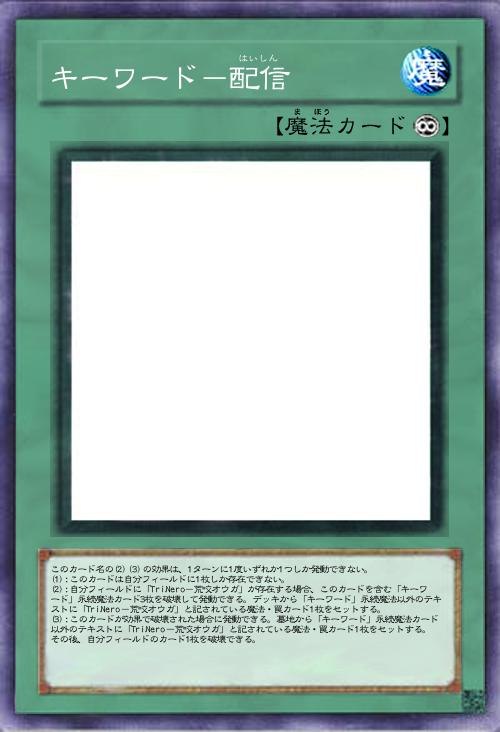 | このカード名の(2)(3)の効果は、1ターンに1度いずれか1つしか発動できない。 (1):このカードは自分フィールドに1枚しか存在できない。 (2):自分フィールドに「TriNero-荒咬オウガ」が存在する場合、このカードを含む「キーワード」永続魔法カード3枚を破壊して発動できる。デッキから「キーワード」永続魔法以外のテキストに「TriNero-荒咬オウガ」と記されている魔法・罠カード1枚をセットする。 (3):このカードが効果で破壊された場合に発動できる。墓地から「キーワード」永続魔法カード以外のテキストに「TriNero-荒咬オウガ」と記されている魔法・罠カード1枚をセットする。その後、自分フィールドのカード1枚を破壊できる。 | |||