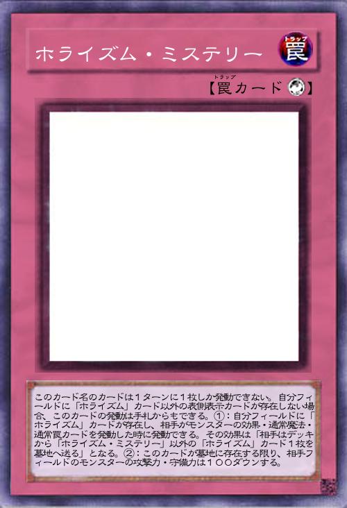 | このカード名のカードは1ターンに1枚しか発動できない。自分フィールドに「ホライズム」カード以外の表側表示カードが存在しない場合、このカードの発動は手札からもできる。①:自分フィールドに「ホライズム」カードが存在し、相手がモンスターの効果・通常魔法・通常罠カードを発動した時に発動できる。その効果は「相手はデッキから「ホライズム・ミステリー」以外の「ホライズム」カード1枚を墓地へ送る」となる。②:このカードが墓地に存在する限り、相手フィールドのモンスターの攻撃力・守備力は100ダウンする。 | |||