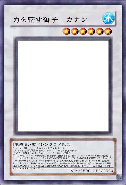 | チューナー1体以上+「チルドレン」モンスター1体 このカード名の①②③の効果は1ターンに1度しか使用できない このカードはルール上「チルドレン」カードとして扱う ①:このモンスターが特殊召喚された場合に発動できる。相手フィールドのカードを1枚破壊する。「セカンドチルドレン カナン」の効果で特殊召喚されている場合3枚まで破壊しても良い。②:表側で除外されているカードを3枚裏側にするまたは裏側で除外されているカードを2枚表側にして発動できる。相手は自身のフィールドのカードを1枚裏側で除外する。③:このカードが墓地に存在する場合、デッキの上から2枚を裏側で除外して発動できる。相手フィールドのカード1枚とこのカードをデッキに戻す。 | |||