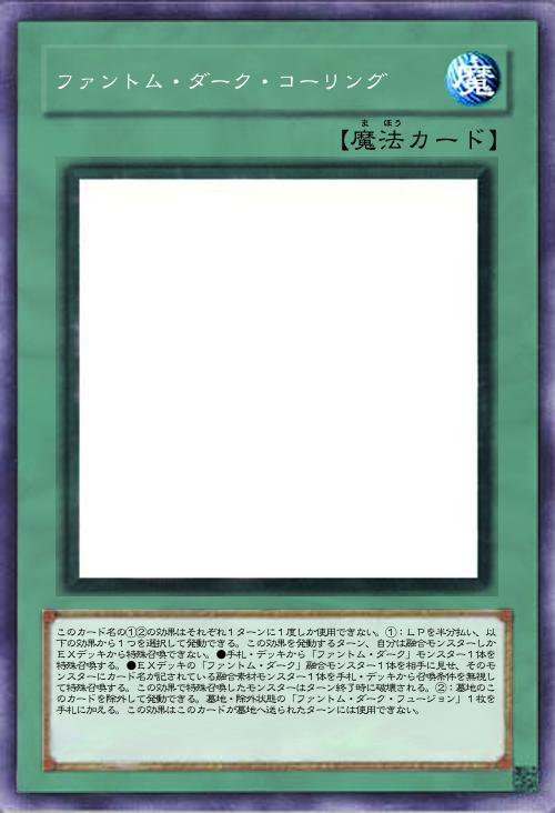 | このカード名の①②の効果はそれぞれ1ターンに1度しか使用できない。①:LPを半分払い、以下の効果から1つを選択して発動できる。この効果を発動するターン、自分は融合モンスターしかEXデッキから特殊召喚できない。●手札・デッキから「ファントム・ダーク」モンスター1体を特殊召喚する。●EXデッキの「ファントム・ダーク」融合モンスター1体を相手に見せ、そのモンスターにカード名が記されている融合素材モンスター1体を手札・デッキから召喚条件を無視して特殊召喚する。この効果で特殊召喚したモンスターはターン終了時に破壊される。②:墓地のこのカードを除外して発動できる。墓地・除外状態の「ファントム・ダーク・フュージョン」1枚を手札に加える。この効果はこのカードが墓地へ送られたターンには使用できない。 | |||