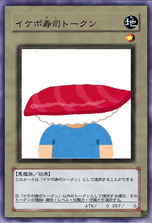 | このカードは「イケボ寿司トークン」として使用することができる ※「イケボ寿司トークン」以外のトークンとして使用する場合、そのトークンの種族・属性・レベル・攻撃力・守備力を適用する。 | |||