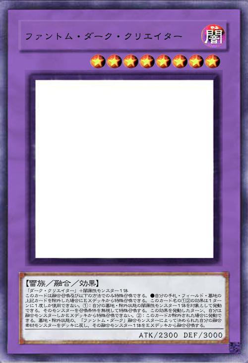 | 「ダーク・クリエイター」+闇属性モンスター1体 このカードは融合召喚及び以下の方法でのみ特殊召喚できる。●自分の手札・フィールド・墓地の上記カードを除外した場合にEXデッキから特殊召喚できる。このカード名の①②の効果は1ターンに1度しか使用できない。①:自分の墓地・除外状態の闇属性モンスター1体を対象として発動できる。そのモンスターを召喚条件を無視して特殊召喚する。この効果を発動したターン、自分は融合モンスターしかEXデッキから特殊召喚できない。②:このカードが除外された場合に発動できる。墓地・除外状態の、「ファントム・ダーク」融合モンスターによって決められた自分の融合素材モンスターをデッキに戻し、その融合モンスター1体をEXデッキから融合召喚する。 | |||