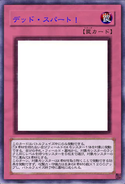 | このカードはバトルフェイズ中にのみ発動できる。 ①X素材を持たない自分フィールドのXモンスター1体を対象に発動できる。自分の手札・フィールド・墓地から、対象モンスターのランクと同じレベルを持つモンスターを5枚まで選び、対象モンスターの下に重ねてX素材とする。 このターン、対象モンスターはX素材を取り除くことで発動できる効果を発動できず、攻撃力・守備力は自身のX素材の数×1200アップし、バトルフェイズ終了時に墓地に送られる。 | |||