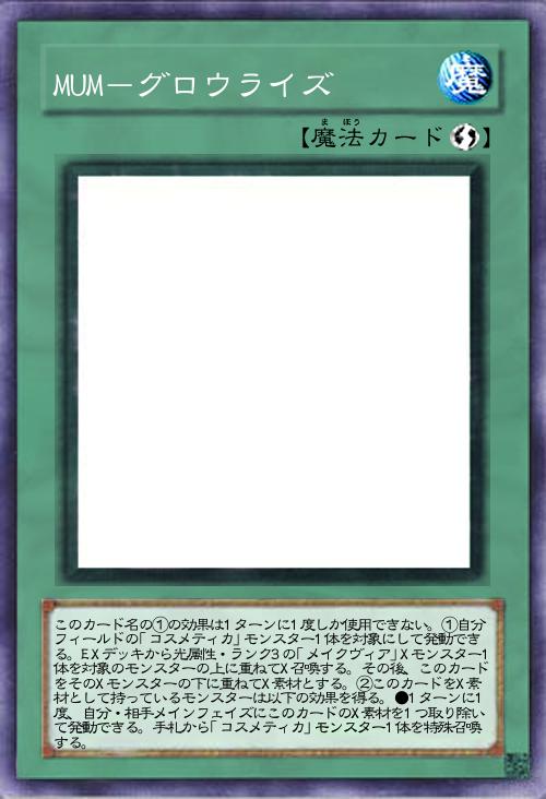| このカード名の①の効果は1ターンに1度しか使用できない。①自分フィールドの「コスメティカ」モンスター1体を対象にして発動できる。EXデッキから光属性・ランク3の「メイクヴィア」Xモンスター1体を対象のモンスターの上に重ねてX召喚する。その後、このカードをそのXモンスターの下に重ねてX素材とする。②このカードをX素材として持っているモンスターは以下の効果を得る。●1ターンに1度、自分・相手メインフェイズにこのカードのX素材を1つ取り除いて発動できる。手札から「コスメティカ」モンスター1体を特殊召喚する。 | |||