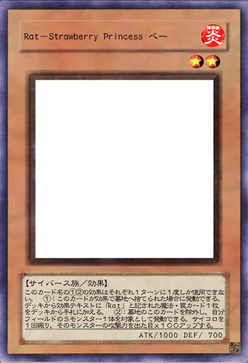 | このカード名の①②の効果はそれぞれ1ターンに1度しか使用できない。 ①:このカードが効果で墓地へ捨てられた場合に発動できる。デッキから効果テキストに「Rat」と記された魔法・罠カード1枚をデッキから手札に加える。 ②:墓地のこのカードを除外し、自分フィールドのSモンスター1体を対象として発動できる。サイコロを1回振り、そのモンスターの攻撃力を出た目x100アップする。 | |||