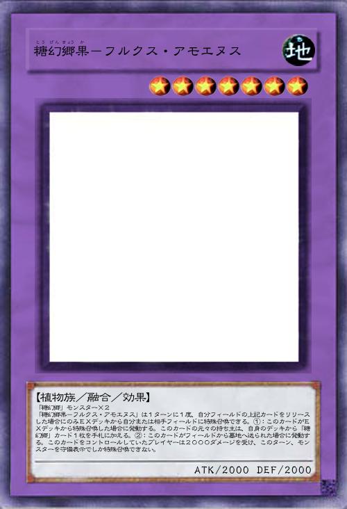 | 「糖幻郷」モンスター×2 「糖幻郷果-フルクス・アモエヌス」は1ターンに1度、自分フィールドの上記カードをリリースした場合にのみEXデッキから自分または相手フィールドに特殊召喚できる。①:このカードがEXデッキから特殊召喚した場合に発動する。このカードの元々の持ち主は、自身のデッキから「糖幻郷」カード1枚を手札に加える。②:このカードがフィールドから墓地へ送られた場合に発動する。このカードをコントロールしていたプレイヤーは2000ダメージを受け、このターン、モンスターを守備表示でしか特殊召喚できない。 | |||