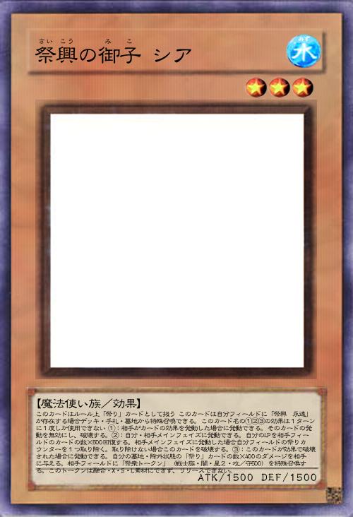 | このカードはルール上「祭り」カードとして扱う このカードは自分フィールドに「祭興 永遠」が存在する場合デッキ・手札・墓地から特殊召喚できる。このカード名の①②③の効果は1ターンに1度しか使用できない ①:相手がカードの効果を発動した場合に発動できる。そのカードの発動を無効にし、破壊する。②:自分・相手メインフェイズに発動できる。自分のLPを相手フィールドのカードの数×500回復する。相手メインフェイズに発動した場合自分フィールドの祭りカウンターを1つ取り除く。取り除けない場合このカードを破壊する。③:このカードが効果で破壊された場合に発動できる。自分の墓地・除外状態の「祭り」カードの数×400のダメージを相手に与える。相手フィールドに「祭衆トークン」(戦士族・闇・星2・攻/守500)を特殊召喚する。このトークンは融合・X・S・L素材にできず、リリースできない。 | |||
