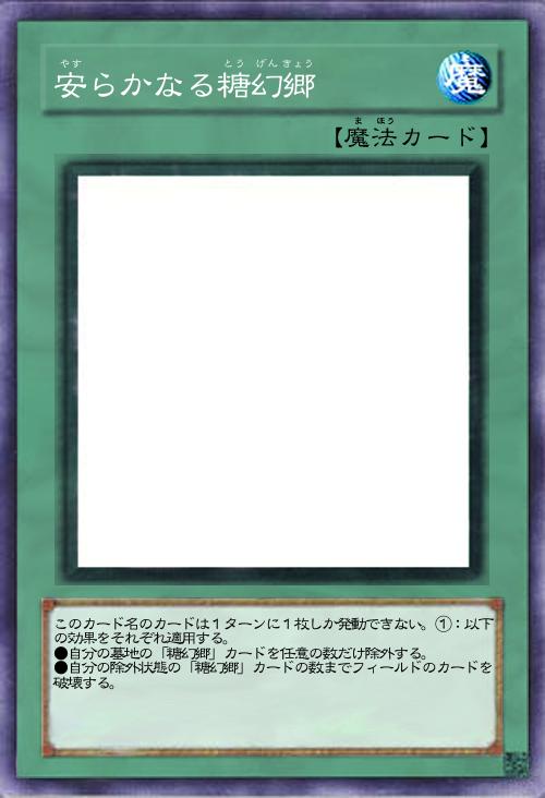| このカード名のカードは1ターンに1枚しか発動できない。①:以下の効果をそれぞれ適用する。 ●自分の墓地の「糖幻郷」カードを任意の数だけ除外する。 ●自分の除外状態の「糖幻郷」カードの数までフィールドのカードを破壊する。 | |||
