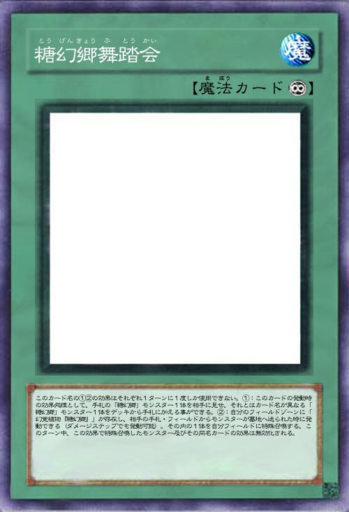 | このカード名の①②の効果はそれぞれ1ターンに1度しか使用できない。①:このカードの発動時の効果処理として、手札の「糖幻郷」モンスター1体を相手に見せ、それとはカード名が異なる「糖幻郷」モンスター1体をデッキから手札に加える事ができる。②:自分のフィールドゾーンに「幻覚植物『糖幻郷』」が存在し、相手の手札・フィールドからモンスターが墓地へ送られた時に発動できる(ダメージステップでも発動可能)。その内の1体を自分フィールドに特殊召喚する。このターン中、この効果で特殊召喚したモンスター及びその同名カードの効果は無効化される。 | |||