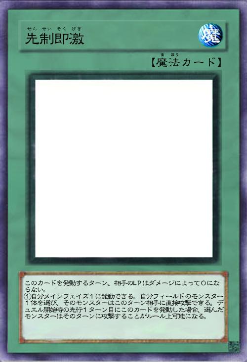 | このカードを発動するターン、相手のLPはダメージによって0にならない。 ①自分メインフェイズ1に発動できる。自分フィールドのモンスター1体を選び、そのモンスターはこのターン相手に直接攻撃できる。デュエル開始時の先行1ターン目にこのカードを発動した場合、選んだモンスターはそのターンに攻撃することがルール上可能になる。 | |||