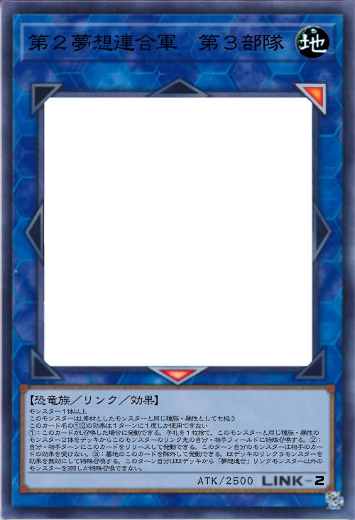 | モンスター1体以上 このモンスターはL素材としたモンスターと同じ種族・属性としても扱う このカード名の①②の効果は1ターンに1度しか使用できない ①:このカードがL召喚した場合に発動できる。手札を1枚捨て、このモンスターと同じ種族・属性のモンスター2体をデッキからこのモンスターのリンク先の自分・相手フィールドに特殊召喚する。②:自分・相手ターンにこのカードをリリースして発動できる。このターン自分のモンスターは相手のカードの効果を受けない。③:墓地のこのカードを除外して発動できる。EXデッキのリンク3モンスターを効果を無効にして特殊召喚する。このターン自分はEXデッキから「夢想連合」リンクモンスター以外のモンスターを3回しか特殊召喚できない。 | |||