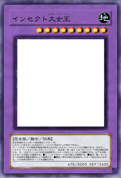 | 昆虫族通常モンスター+昆虫族モンスター×2 このカード名のカードは自分フィールドに1体までしか存在できない。 (1):このカードの特殊召喚成功時またはお互いのスタンバイフェイズに発動できる。自分フィールドに「インセクトモンスタートークン」(昆虫族・地・星1・攻/守100)1体を特殊召喚する。(2):自分フィールドの昆虫族通常モンスター1体をリリースして発動できる。以下の効果のうち一つを選んで適用する。●フィールドのカード2枚を選んで破壊する。●魔法・罠・モンスターの効果の発動を無効にして破壊する。●墓地・除外状態の昆虫族モンスター1体を手札に加える。この効果は相手ターンでも発動できる。 | |||