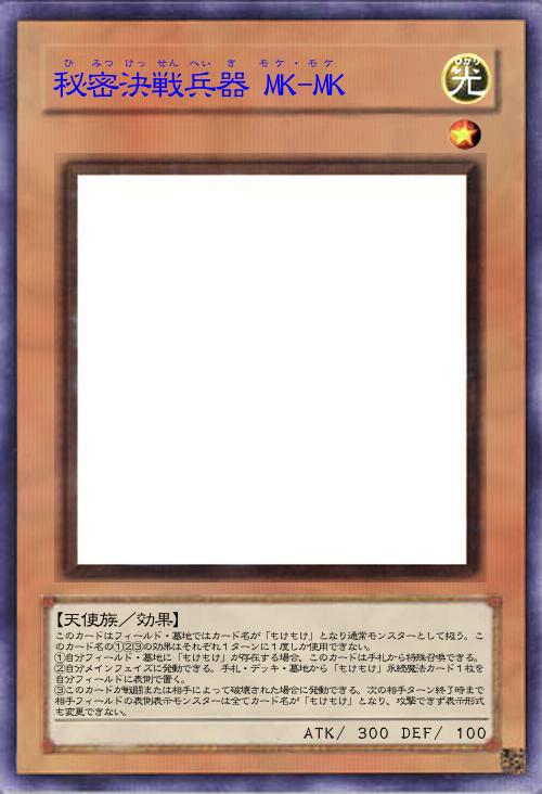 | このカードはフィールド・墓地ではカード名が「もけもけ」となり通常モンスターとして扱う。このカード名の①②③の効果はそれぞれ1ターンに1度しか使用できない。 ①自分フィールド・墓地に「もけもけ」が存在する場合、このカードは手札から特殊召喚できる。 ②自分メインフェイズに発動できる。手札・デッキ・墓地から「もけもけ」永続魔法カード1枚を自分フィールドに表側で置く。 ③このカードが戦闘または相手によって破壊された場合に発動できる。次の相手ターン終了時まで相手フィールドの表側表示モンスターは全てカード名が「もけもけ」となり、攻撃できず表示形式も変更できない。 | |||