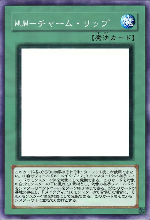 | このカード名の①②の効果はそれぞれ1ターンに1度しか使用できない。①自分フィールドの「メイクヴィア」Xモンスター1体と相手フィールドのモンスター1体を対象にして発動できる。このカードを対象の自分モンスターの下に重ねてX素材とし、対象の相手フィールドのモンスターのコントロールをターン終了時まで得る。②このカードが墓地に存在し、「メイクヴィア」XモンスターがX召喚した場合に、そのXモンスター1体を対象にして発動できる。このカードをそのXモンスターの下に重ねてX素材とする。 | |||