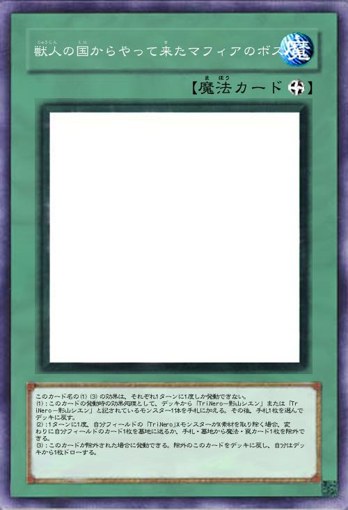 | このカード名の(1)(3)の効果は、それぞれ1ターンに1度しか発動できない。 (1):このカードの発動時の効果処理として、デッキから「TriNero-影山シエン」または「TriNero-影山シエン」と記されているモンスター1体を手札に加える。その後、手札1枚を選んでデッキに戻す。 (2):1ターンに1度、自分フィールドの「TriNero」XモンスターがX素材を取り除く場合、変わりに自分フィールドのカード1枚を墓地に送るか、手札・墓地から魔法・罠カード1枚を除外できる。 (3):このカードが除外された場合に発動できる。除外のこのカードをデッキに戻し、自分はデッキから1枚ドローする。 | |||