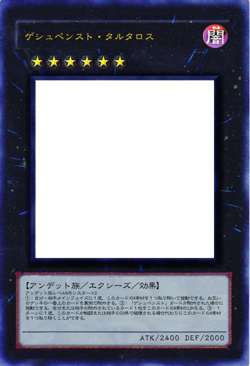 | アンデット族レベル6モンスター×2 ①:自分・相手メインフェイズに1度、このカードのX素材を1つ取り除いて発動できる。お互いのデッキの一番上のカードを裏側で除外する。②:「ゲシュペンスト」カードが除外された場合に発動できる。自分または相手の除外されているカード1枚をこのカードのX素材に加える。③:1ターンに1度、このカードが戦闘または相手の効果で破壊される場合代わりにこのカードのX素材を1つ取り除くことができる。 | |||