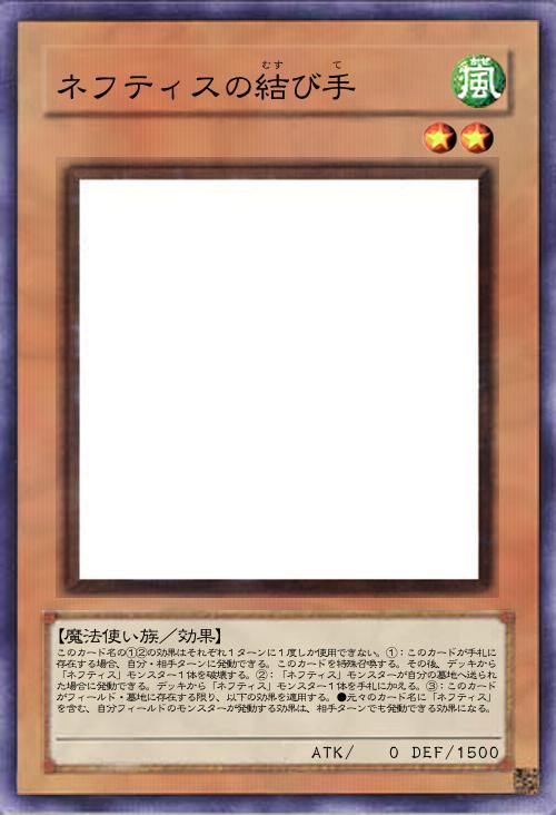 | このカード名の①②の効果はそれぞれ1ターンに1度しか使用できない。①:このカードが手札に存在する場合、自分・相手ターンに発動できる。このカードを特殊召喚する。その後、デッキから「ネフティス」モンスター1体を破壊する。②:「ネフティス」モンスターが自分の墓地へ送られた場合に発動できる。デッキから「ネフティス」モンスター1体を手札に加える。③:このカードがフィールド・墓地に存在する限り、以下の効果を適用する。●元々のカード名に「ネフティス」を含む、自分フィールドのモンスターが発動する効果は、相手ターンでも発動できる効果になる。 | |||