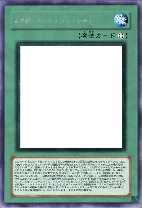 | このカード名のカードは1ターンに1枚しか発動できず、②③の効果はそれぞれ1ターンに1度しか使用できない。①:このカードの発動時の効果処理として、デッキからレベル5以上の通常召喚できないドラゴン族モンスター1体を手札に加える事ができる。この効果でカードをデッキから手札に加えた場合、更に自分は600LP失う。②:自分フィールドにモンスターが存在しない場合、手札を2枚デッキに戻して発動できる。自分フィールドに「石の巨人トークン(岩石族・地・星2・攻400/守2000)」2体を特殊召喚する。「石の巨人トークン」は、S・L素材にできず、特殊召喚したターンにはアドバンス・儀式召喚の為にはリリースできず、戦闘を行わなかったターンのエンドフェイズにこのカードのコントローラーは500ダメージを受ける。③:元々のカード名が「古代竜-エンシェント・ドラゴン」となる、自分フィールドの表側表示モンスターが相手の効果でフィールドから離れた場合に発動する。このターンのエンドフェイズに自分の手札・デッキ・墓地からドラゴン族・闇属性・レベル8のモンスター1体を特殊召喚する。 | |||