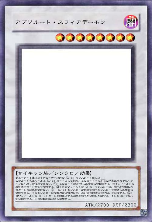 | チューナー1体以上+チューナー以外の「A・G」モンスター1体以上 このカード名はルール上「A・G」カードとして扱う。このカード名の①④の効果はそれぞれ1ターンに1度しか使用できない。①:このカードがS召喚した場合に発動できる。相手フィールドの表側表示カード全てを除外する。②:自分フィールドの「A・G」モンスターは、相手が発動した罠カードの効果を受けない。③:「A・G」モンスターが戦闘で相手モンスターを破壊した場合に発動できる。そのモンスターの攻撃力か守備力の内、高い方の数値分自分のLPを回復する。④:自分フィールドの「A・G」カードを対象とする効果を相手が発動した場合に、1000LPを払って発動できる。その発動を無効にし破壊する。 | |||