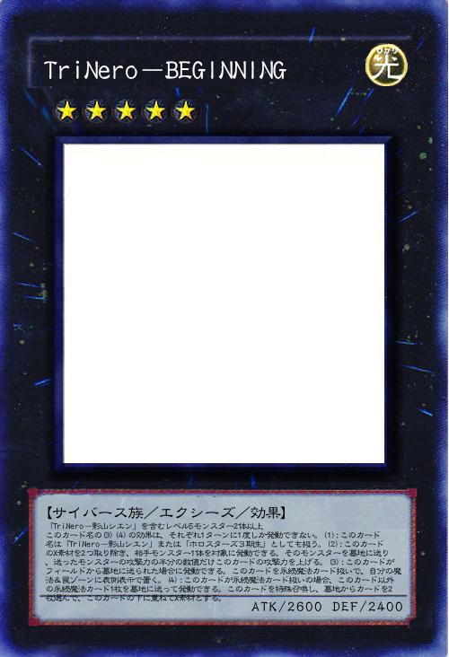 | 「TriNero-影山シエン」を含むレベル5モンスター2体以上 このカード名の(3)(4)の効果は、それぞれ1ターンに1度しか発動できない。(1):このカード名は「TriNero-影山シエン」または「ホロスターズ3期生」としても扱う。(2):このカードのX素材を2つ取り除き、相手モンスター1体を対象に発動できる。そのモンスターを墓地に送り、送ったモンスターの攻撃力の半分の数値だけこのカードの攻撃力を上げる。(3):このカードがフィールドから墓地に送られた場合に発動できる。このカードを永続魔法カード扱いで、自分の魔法&罠ゾーンに表側表示で置く。(4):このカードが永続魔法カード扱いの場合、このカード以外の永続魔法カード1枚を墓地に送って発動できる。このカードを特殊召喚し、墓地からカードを2枚選んで、このカードの下に重ねてX素材とする。 | |||