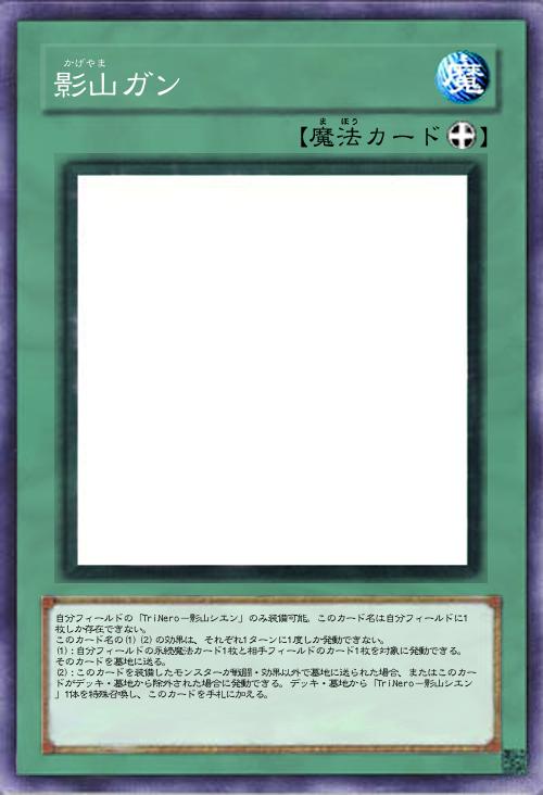 | 自分フィールドの「TriNero-影山シエン」のみ装備可能。このカード名は自分フィールドに1枚しか存在できない。 このカード名の(1)(2)の効果は、それぞれ1ターンに1度しか発動できない。 (1):自分フィールドの永続魔法カード1枚と相手フィールドのカード1枚を対象に発動できる。そのカードを墓地に送る。 (2):このカードを装備したモンスターが戦闘・効果以外で墓地に送られた場合、またはこのカードがデッキ・墓地から除外された場合に発動できる。デッキ・墓地から「TriNero-影山シエン」1体を特殊召喚し、このカードを手札に加える。 | |||