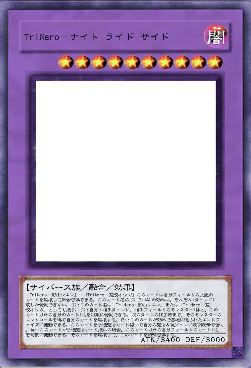 | 「TriNero-影山シエン」+「TriNero-荒咬オウガ」このカードは自分フィールドの上記のカードを破壊して融合召喚できる。このカード名の(2)(3)(4)の効果は、それぞれ1ターンに1度しか発動できない。(1):このカード名は「TriNero-影山シエン」または「TriNero-荒咬オウガ」としても扱う。(2):自分・相手ターンに、相手フィールドのモンスター1体と、このカード以外の自分のカード1枚を対象に発動できる。次のターンの終了時まで、そのモンスターのコントロールを得て自分のカードを破壊する。(3):このカードが効果で墓地に送られたエンドフェイズに発動できる。このカードを永続魔法カード扱いで自分の魔法&罠ゾーンに表側表示で置く。(4):このカードが永続魔法カード扱いの場合、このカード以外の自分フィールドのカード1枚を対象に発動できる。そのカードを破壊して、このカードを特殊召喚する。 | |||