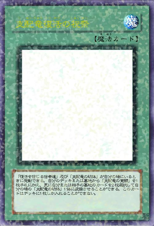 | 「復活を信じる信者達」及び「支配竜の幼体」が自分の場にいるときに発動できる。自分のデッキまたは墓地から「支配竜の覚醒」を1枚手札に加え、更に自分または相手の墓地のカードを2枚選択して自分の場の「支配竜の幼体」1体に装備させることができる。このカードはデッキに1枚しか入れることができない。 | |||