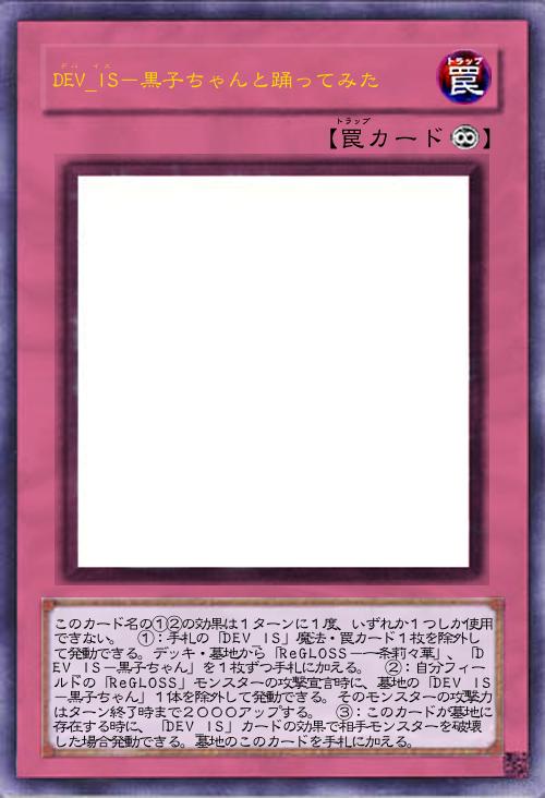| このカード名の①②の効果は1ターンに1度、いずれか1つしか使用できない。 ①:手札の「DEV_IS」魔法・罠カード1枚を除外して発動できる。デッキ・墓地から「ReGLOSS-一条莉々華」、「DEV_IS-黒子ちゃん」を1枚ずつ手札に加える。 ②:自分フィールドの「ReGLOSS」モンスターの攻撃宣言時に、墓地の「DEV_IS-黒子ちゃん」1体を除外して発動できる。そのモンスターの攻撃力はターン終了時まで2000アップする。 ③:このカードが墓地に存在する時に、「DEV_IS」カードの効果で相手モンスターを破壊した場合発動できる。墓地のこのカードを手札に加える。 | |||