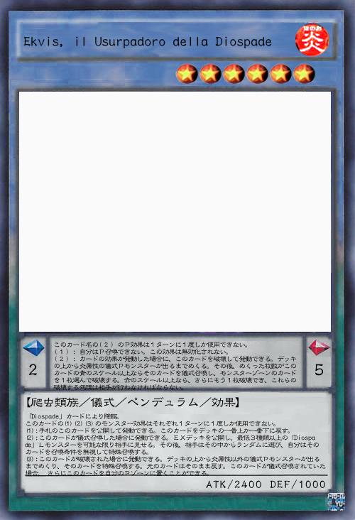 | 「Diospade」カードにより降臨。 このカードの(1)(2)(3)のモンスター効果はそれぞれ1ターンに1度しか使用できない。 (1):手札のこのカードを公開して発動できる。このカードをデッキの一番上か一番下に戻す。 (2):このカードが儀式召喚した場合に発動できる。EXデッキを公開し、最低3種類以上の「Diospade」Lモンスターを可能な限り相手に見せる。その後、相手はその中からランダムに選び、自分はそのカードを召喚条件を無視して特殊召喚する。 (3):このカードが破壊された場合に発動できる。デッキの上から炎属性以外の儀式Pモンスターが出るまでめくり、そのカードを特殊召喚する。元のカードはそのまま戻す。このカードが儀式召喚されていた場合、 さらにこのカードを自分のPゾーンに置くことができる。 | |||