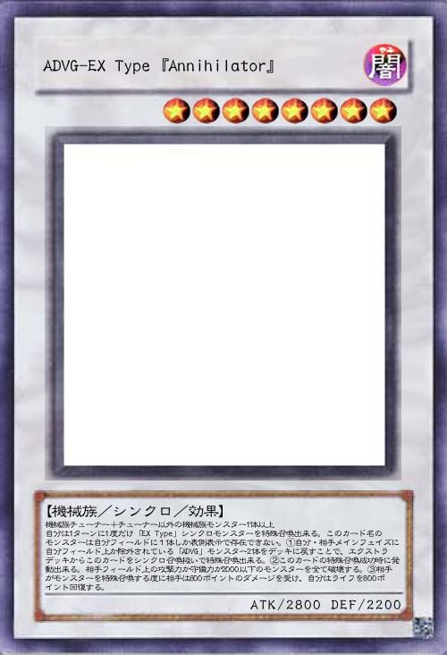 | 機械族チューナー+チューナー以外の機械族モンスター1体以上 自分は1ターンに1度だけ「EX Type」シンクロモンスターを特殊召喚出来る。このカード名のモンスターは自分フィールドに1体しか表側表示で存在できない。①自分・相手メインフェイズに自分フィールド上か除外されている「ADVG」モンスター2体をデッキに戻すことで、エクストラデッキからこのカードをシンクロ召喚扱いで特殊召喚出来る。②このカードの特殊召喚成功時に発動出来る。相手フィールド上の攻撃力か守備力が2000以下のモンスターを全て破壊する。③相手がモンスターを特殊召喚する度に相手は800ポイントのダメージを受け、自分はライフを800ポイント回復する。 | |||