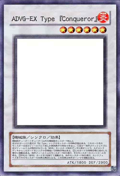 | 機械族チューナー+チューナー以外の機械族モンスター1体以上 自分は1ターンに1度だけ「EX Type」シンクロモンスターを特殊召喚出来る。このカード名のモンスターは自分フィールドに1体しか表側表示で存在できない。①自分・相手メインフェイズに自分フィールド上か除外されている「ADVG」モンスター2体をデッキに戻すことで、エクストラデッキからこのカードをシンクロ召喚扱いで特殊召喚出来る。②このカードの特殊召喚に成功した場合に発動出来る。相手フィールド上のモンスター1体を選び、そのモンスターのコントロールを得る。③手札の「ADVG」カードを1枚捨てて発動する。相手モンスター1体を選び、エンドフェイズまでそのモンスターの効果は無効になる。この効果は相手ターンでも発動出来る。 | |||
