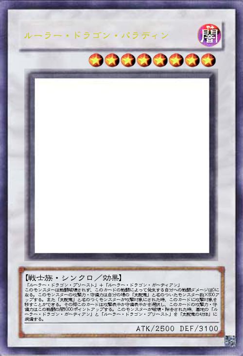「ルーラー・ドラゴン・プリースト」+「ルーラー・ドラゴン・ガーディアン」 このモンスターは戦闘破壊されず、このカードの戦闘によって発生する自分への戦闘ダメージは0になる。このモンスターの攻撃力・守備力は自分の場の「支配竜」と名のついたモンスター数×500アップする。また「支配竜」と名のつくモンスターが攻撃対象にされた時、このカードに攻撃対象を移すことができる。その際このカードは攻撃表示か守備表示かを選択し、このカードの攻撃力・守備力はこの戦闘の間1000ポイントアップする。このモンスターが破壊・除去された時、墓地の「ルーラー・ドラゴン・ガーディアン」と「ルーラー・ドラゴン・プリースト」を「支配竜の幼体」に装備する。 |