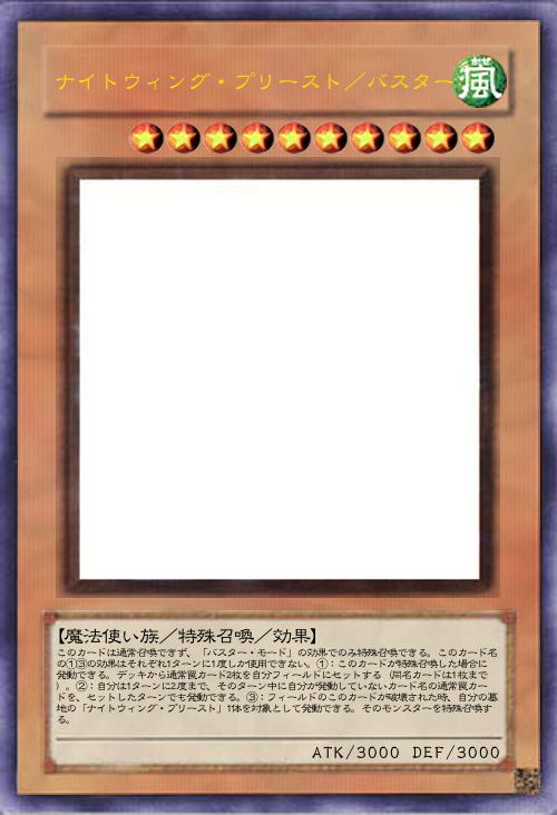 | このカードは通常召喚できず、「バスター・モード」の効果でのみ特殊召喚できる。このカード名の①③の効果はそれぞれ1ターンに1度しか使用できない。①:このカードが特殊召喚した場合に発動できる。デッキから通常罠カード2枚を自分フィールドにセットする(同名カードは1枚まで)。②:自分は1ターンに2度まで、そのターン中に自分が発動していないカード名の通常罠カードを、セットしたターンでも発動できる。③:フィールドのこのカードが破壊された時、自分の墓地の「ナイトウィング・プリースト」1体を対象として発動できる。そのモンスターを特殊召喚する。 | |||