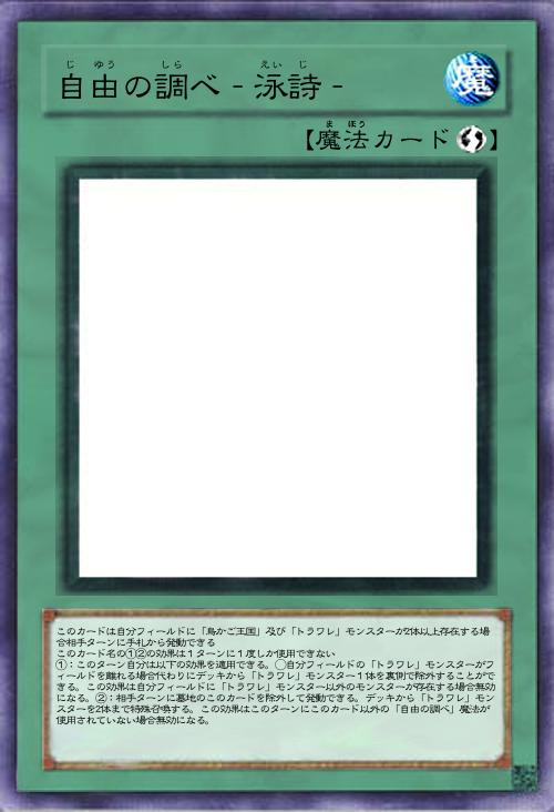 | このカードは自分フィールドに「鳥かご王国」及び「トラワレ」モンスターが2体以上存在する場合相手ターンに手札から発動できる このカード名の①②の効果は1ターンに1度しか使用できない ①:このターン自分は以下の効果を適用できる。◯自分フィールドの「トラワレ」モンスターがフィールドを離れる場合代わりにデッキから「トラワレ」モンスター1体を裏側で除外することができる。この効果は自分フィールドに「トラワレ」モンスター以外のモンスターが存在する場合無効になる。②:相手ターンに墓地のこのカードを除外して発動できる。デッキから「トラワレ」モンスターを2体まで特殊召喚する。この効果はこのターンにこのカード以外の「自由の調べ」魔法が使用されていない場合無効になる。 | |||