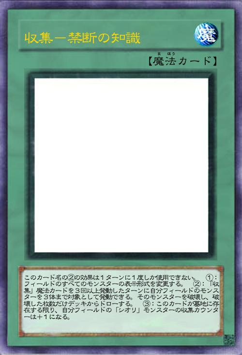 | このカード名の②の効果は1ターンに1度しか使用できない。 ①:フィールドのすべてのモンスターの表示形式を変更する。 ②:「収集」魔法カードを3回以上発動したターンに自分フィールドのモンスターを3体まで対象として発動できる。そのモンスターを破壊し、破壊した枚数だけデッキからドローする。 ③:このカードが墓地に存在する限り、自分フィールドの「シオリ」モンスターの収集カウンターは+1になる。 | |||