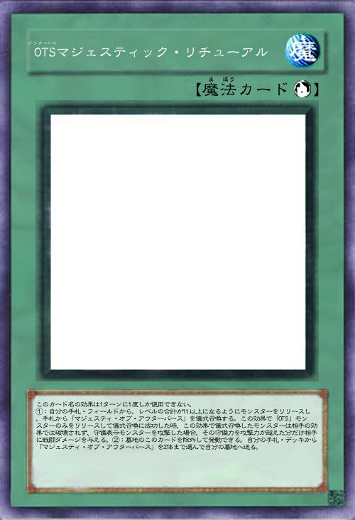 | このカード名の効果は1ターンに1度しか使用できない。 ①:自分の手札・フィールドから、レベルの合計が11以上になるようにモンスターをリリースし、手札から「マジェスティ・オブ・アウターバース」を儀式召喚する。この効果で「OTS」モンスターのみをリリースして儀式召喚に成功した時、この効果で儀式召喚したモンスターは相手の効果では破壊されず、守備表示モンスターを攻撃した場合、その守備力を攻撃力が超えた分だけ相手に戦闘ダメージを与える。②:墓地のこのカードを除外して発動できる。自分の手札・デッキから「マジェスティ・オブ・アウターバース」を2体まで選んで自分の墓地へ送る。 | |||