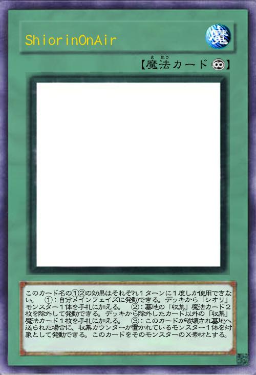 | このカード名の①②の効果はそれぞれ1ターンに1度しか使用できない。 ①:自分メインフェイズに発動できる。デッキから「シオリ」モンスター1体を手札に加える。 ②:墓地の「収集」魔法カード2枚を除外して発動できる。デッキから除外したカード以外の「収集」魔法カード1枚を手札に加える。 ③:このカードが破壊され墓地へ送られた場合に、収集カウンターが置かれているモンスター1体を対象として発動できる。このカードをそのモンスターのX素材とする。 | |||