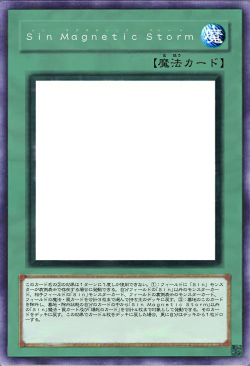 | このカード名の②の効果は1ターンに1度しか使用できない。①:フィールドに「Sin」モンスターが表側表示で存在する場合に発動できる。自分フィールドの「Sin」以外のモンスターカード、相手フィールドの「Sin」モンスターカード、フィールドの裏側表示のモンスターカード、フィールドの魔法・罠カードを合計3枚まで選んで持ち主のデッキに戻す。②:墓地のこのカードを除外し、墓地・除外状態の自分のカードの中から「Sin Magnetic Storm」以外の「Sin」魔法・罠カード及び「爆死のカード」を合計4枚まで対象として発動できる。そのカードをデッキに戻す。この効果でカード4枚をデッキに戻した場合、更に自分はデッキから1枚ドローする。 | |||