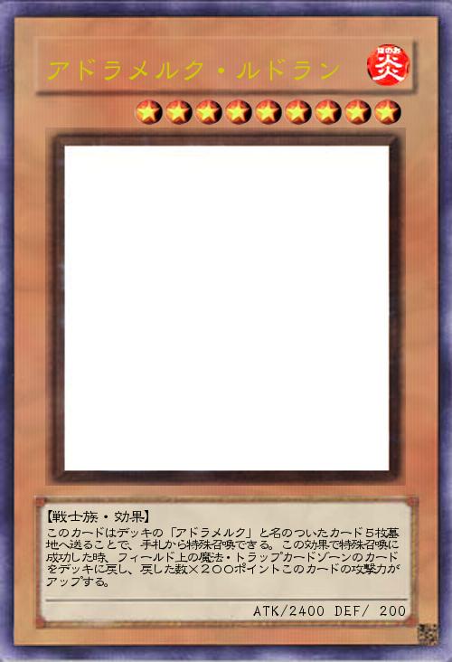 | このカードはデッキの「アドラメルク」と名のついたカード5枚墓地へ送ることで、手札から特殊召喚できる。この効果で特殊召喚に成功した時、フィールド上の魔法・トラップカードゾーンのカードをデッキに戻し、戻した数×200ポイントこのカードの攻撃力がアップする。 | |||