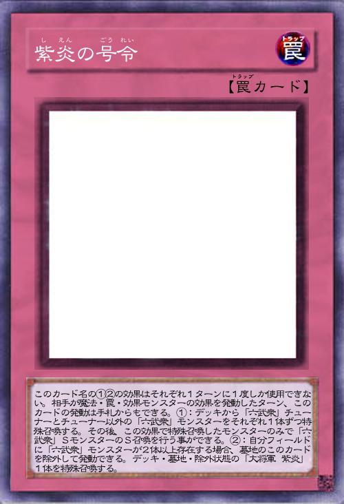 | このカード名の①②の効果はそれぞれ1ターンに1度しか使用できない。相手が魔法・罠・効果モンスターの効果を発動したターン、このカードの発動は手札からもできる。①:デッキから「六武衆」チューナーとチューナー以外の「六武衆」モンスターをそれぞれ1体ずつ特殊召喚する。その後、この効果で特殊召喚したモンスターのみで「六武衆」SモンスターのS召喚を行う事ができる。②:自分フィールドに「六武衆」モンスターが2体以上存在する場合、墓地のこのカードを除外して発動できる。デッキ・墓地・除外状態の「大将軍 紫炎」1体を特殊召喚する。 | |||