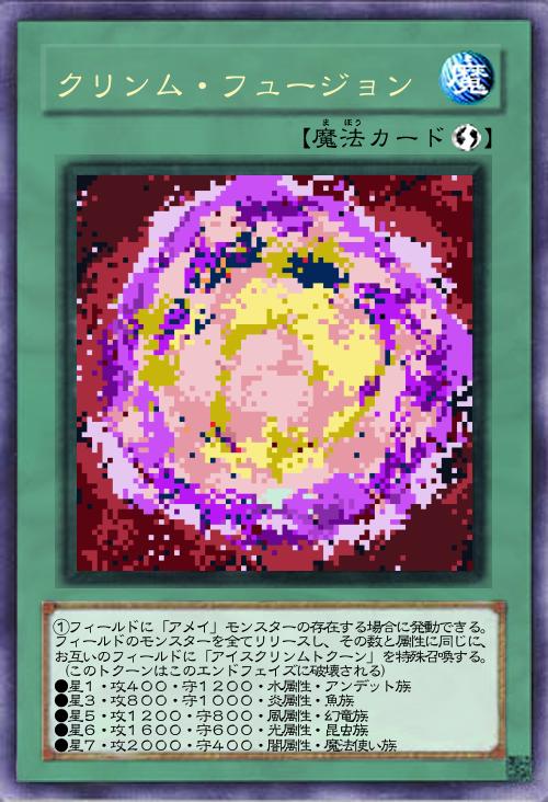| ①フィールドに「アメイ」モンスターの存在する場合に発動できる。 フィールドのモンスターを全てリリースし、その数と属性に同じに、お互いのフィールドに「アイスクリンムトクーン」を特殊召喚する。(このトクーンはこのエンドフェイズに破壊される) ●星1・攻400・守1200・水属性・アンデット族 ●星3・攻800・守1000・炎属性・魚族 ●星5・攻1200・守800・風属性・幻竜族 ●星6・攻1600・守600・光属性・昆虫族 ●星7・攻2000・守400・闇属性・魔法使い族 | |||