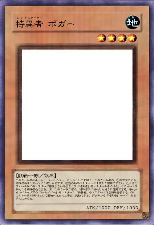 | このカード名はルール上「X-セイバー」カードとしても扱う。このカード名の、①の方法による特殊召喚は1ターンに1度しかできず、②③の効果は1ターンに1度しか使用できない。①:自分フィールドにモンスターが存在しない場合または「特異者」モンスターのみの場合、このカードは手札から特殊召喚できる。②:このカードが召喚、特殊召喚に成功した場合に発動できる。手札からレベル4以下の「X-セイバー」モンスターか「特異者」モンスター1体を特殊召喚する。③:このカードがS素材として墓地へ送られた場合に発動できる。デッキから「特異者」カード1枚を手札に加える。 | |||