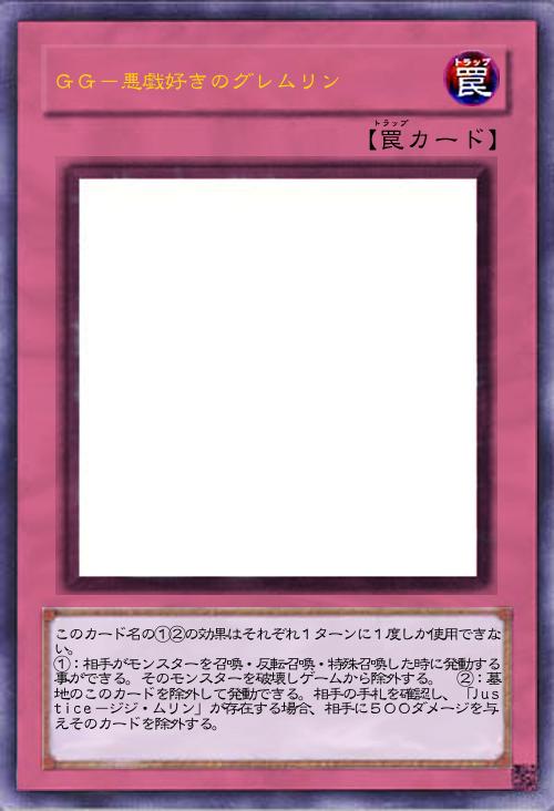 | このカード名の①②の効果はそれぞれ1ターンに1度しか使用できない。 ①:相手がモンスターを召喚・反転召喚・特殊召喚した時に発動する事ができる。そのモンスターを破壊しゲームから除外する。 ②:墓地のこのカードを除外して発動できる。相手の手札を確認し、「Justice-ジジ・ムリン」が存在する場合、相手に500ダメージを与えそのカードを除外する。 | |||