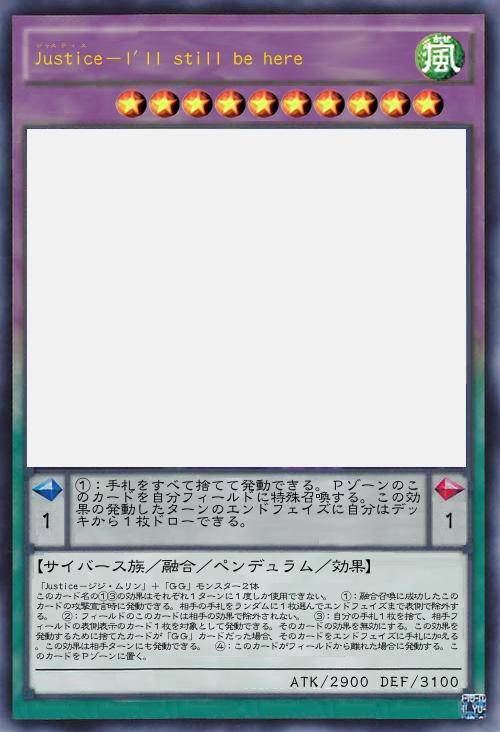 | 「Justice-ジジ・ムリン」+「GG」モンスター2体 このカード名の①③の効果はそれぞれ1ターンに1度しか使用できない。 ①:融合召喚に成功したこのカードの攻撃宣言時に発動できる。相手の手札をランダムに1枚選んでエンドフェイズまで表側で除外する。 ②:フィールドのこのカードは相手の効果で除外されない。 ③:自分の手札1枚を捨て、相手フィールドの表側表示のカード1枚を対象として発動できる。そのカードの効果を無効にする。この効果を発動するために捨てたカードが「GG」カードだった場合、そのカードをエンドフェイズに手札に加える。この効果は相手ターンにも発動できる。 ④:このカードがフィールドから離れた場合に発動する。このカードをPゾーンに置く。 | |||