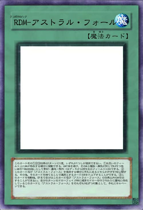 | このカード名の①②③効果は1ターンに1度、いずれか1つしか使用できない。①お互いのフィールド上にXMが存在する場合に発動できる。XM1体を選び、そのMと種族・属性が同じでRが2つ低いXMを1体XNS扱いとして素材・墓地・除外・EXデッキから持ち主のフィールドにSSできる。②このカード及び「アストラル・フォース」を使用する場合に手札にあるどちらか片方を1枚公開する。その後、そのカードを捨てることで適用とするカードのRを+1上下することができる。③このカードを発動後、EPまで自分はこのカード及び「アストラル・フォース」の効果以外のMをSSすることができない。自分のターンのドローフェイズ時に通常のドローを行う代わりに墓地に存在しているこのカードと「アストラル・フォース」をそれぞれ1枚ずつ対象として、手札にサルベージできる。 | |||