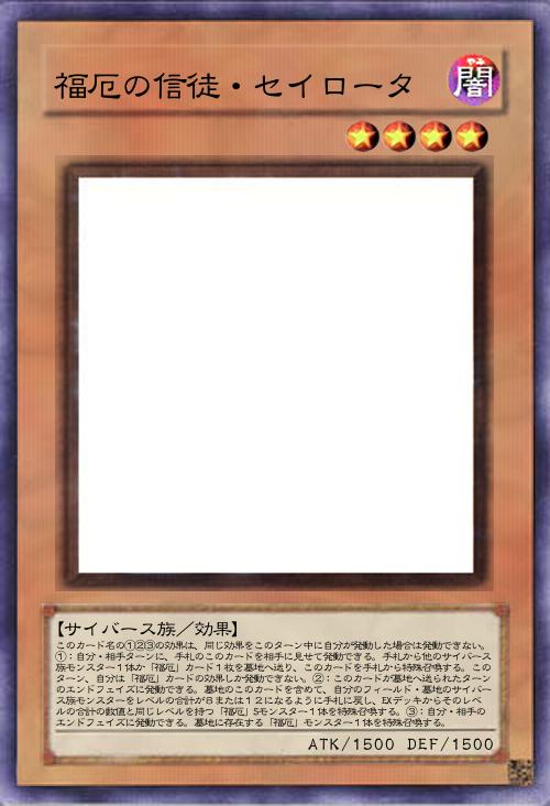 | このカード名の①②③の効果は、同じ効果をこのターン中に自分が発動した場合は発動できない。①:自分・相手ターンに、手札のこのカードを相手に見せて発動できる。手札から他のサイバース族モンスター1体か「福厄」カード1枚を墓地へ送り、このカードを手札から特殊召喚する。このターン、自分は「福厄」カードの効果しか発動できない。②:このカードが墓地へ送られたターンのエンドフェイズに発動できる。墓地のこのカードを含めて、自分のフィールド・墓地のサイバース族モンスターをレベルの合計が8または12になるように手札に戻し、EXデッキからそのレベルの合計の数値と同じレベルを持つ「福厄」Sモンスター1体を特殊召喚する。③:自分・相手のエンドフェイズに発動できる。墓地に存在する「福厄」モンスター1体を特殊召喚する。 | |||