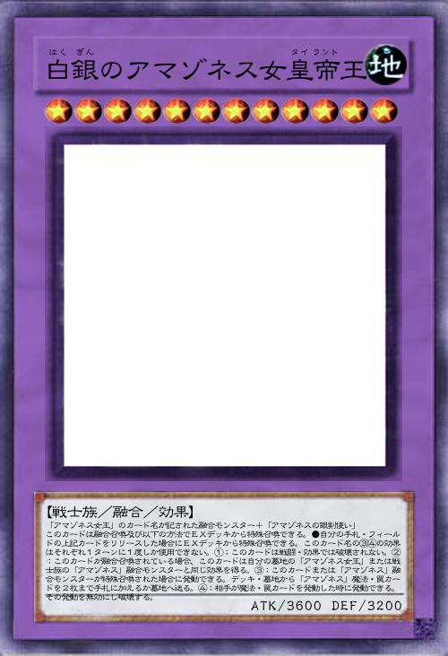 | 「アマゾネス女王」のカード名が記された融合モンスター+「アマゾネスの銀剣使い」 このカードは融合召喚及び以下の方法でEXデッキから特殊召喚できる。●自分の手札・フィールドの上記カードをリリースした場合にEXデッキから特殊召喚できる。このカード名の③④の効果はそれぞれ1ターンに1度しか使用できない。①:このカードは戦闘・効果では破壊されない。②:このカードが融合召喚されている場合、このカードは自分の墓地の「アマゾネス女王」または戦士族の「アマゾネス」融合モンスターと同じ効果を得る。③:このカードまたは「アマゾネス」融合モンスターが特殊召喚された場合に発動できる。デッキ・墓地から「アマゾネス」魔法・罠カードを2枚まで手札に加えるか墓地へ送る。④:相手が魔法・罠カードを発動した時に発動できる。その発動を無効にし破壊する。 | |||