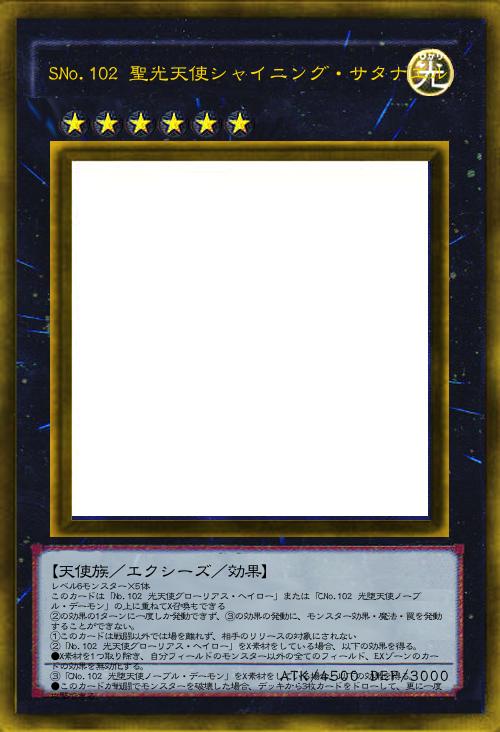 | レベル6モンスター×5体 このカードは「No.102 光天使グローリアス・ヘイロー」または「CNo.102 光堕天使ノーブル・デーモン」の上に重ねてX召喚もできる ②の効果の1ターンに一度しか発動できず、③の効果の発動に、モンスター効果・魔法・罠を発動することができない。 ①このカードは戦闘以外では場を離れず、相手のリリースの対象にされない ②「No.102 光天使グローリアス・ヘイロー」をX素材をしている場合、以下の効果を得る。 ●X素材を1つ取り除き、自分フィールドのモンスター以外の全てのフィールド、EXゾーンのカードの効果を無効化して、相手フィールド、EXゾーンのモンスター攻撃力を0にする。 ③「CNo.102 光堕天使ノーブル・デーモン」をX素材をしている場合、以下の効果を得る。 ●このカードが戦闘でモンスターを破壊した場合、デッキから3枚カードをドローして、更に一度攻撃できる。 | |||