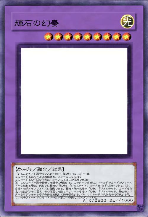 | 「ジェムナイト」融合モンスター1体+「幻奏」モンスター1体 このカード名はルール上天使族モンスターとしても扱う このカード名の①②の効果は1ターンに1度しか使用できない ①:このカードが融合召喚した場合に発動する。このターン自分はフィールドのカードがフィールドから離れる場合、代わりに墓地の「幻奏」「ジェムナイト」カードを1枚ずつ除外できる。②:自分・相手メインフェイズに発動できる。墓地・除外状態の「幻奏」「ジェムナイト」カードを任意の枚数デッキに戻す。その後戻した数と同じレベルを持つ「幻奏」「ジェムナイト」融合モンスターをEXデッキから召喚条件を無視して特殊召喚する。③:このカードが表側表示で存在する限り、相手フィールドのモンスターは攻撃力・守備力が500ダウンする。 | |||